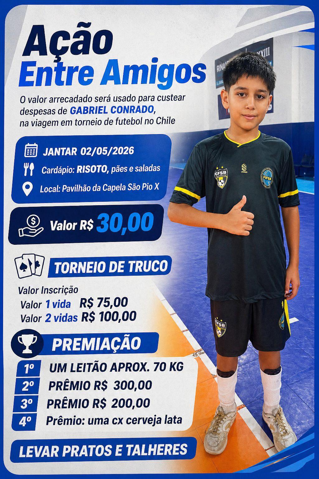 A comunidade se organiza em mais uma iniciativa que mostra força quando o assunto é solidariedade. A “Ação Entre Amigos” foi criada para arrecadar recursos e viabilizar a participação do jovem atleta Gabriel Conrado em um torneio de futebol no Chile.