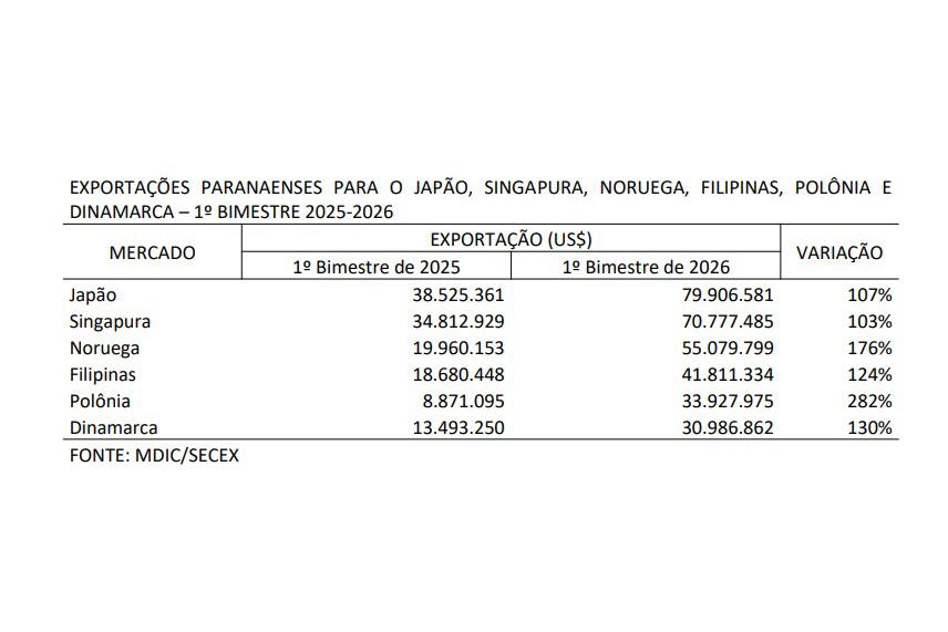 Juntos, os seis mercados passaram a responder por 10,1% das exportações totais do Paraná, muito acima da participação de 4,1% registrada nos dois primeiros meses de 2025.