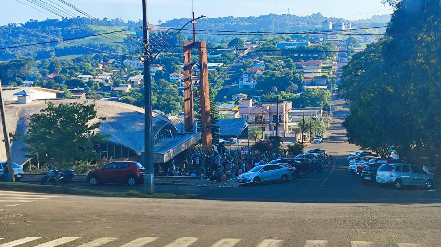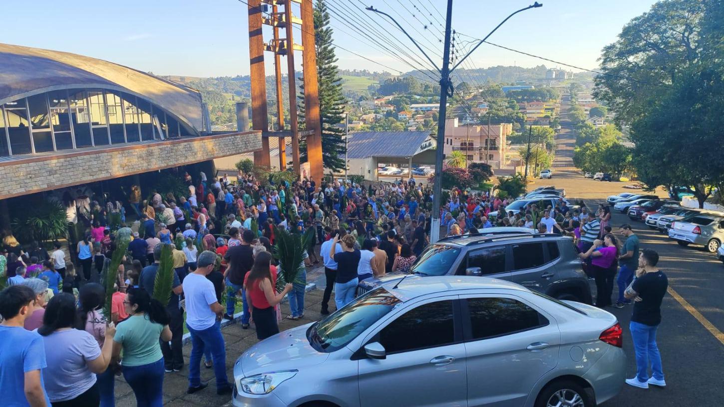 A celebração foi conduzida pelo pároco Padre Victor Clemente Müller, reunindo um grande número de fiéis que participaram ativamente da tradicional bênção dos ramos e da procissão, que simboliza a entrada triunfal de Jesus em Jerusalém.