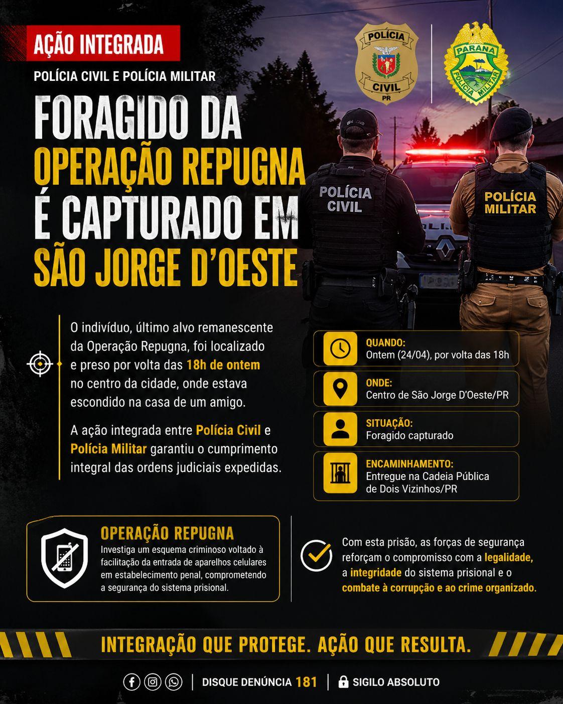 Uma ação integrada entre a Polícia Civil e a Polícia Militar resultou na prisão de um foragido da Operação Repugna na tarde de Sexta-feira (24), em São Jorge D’Oeste. O indivíduo, considerado o último alvo remanescente da operação, foi localizado por volta das 18h, na região central da cidade, onde estava escondido na residência de um conhecido.