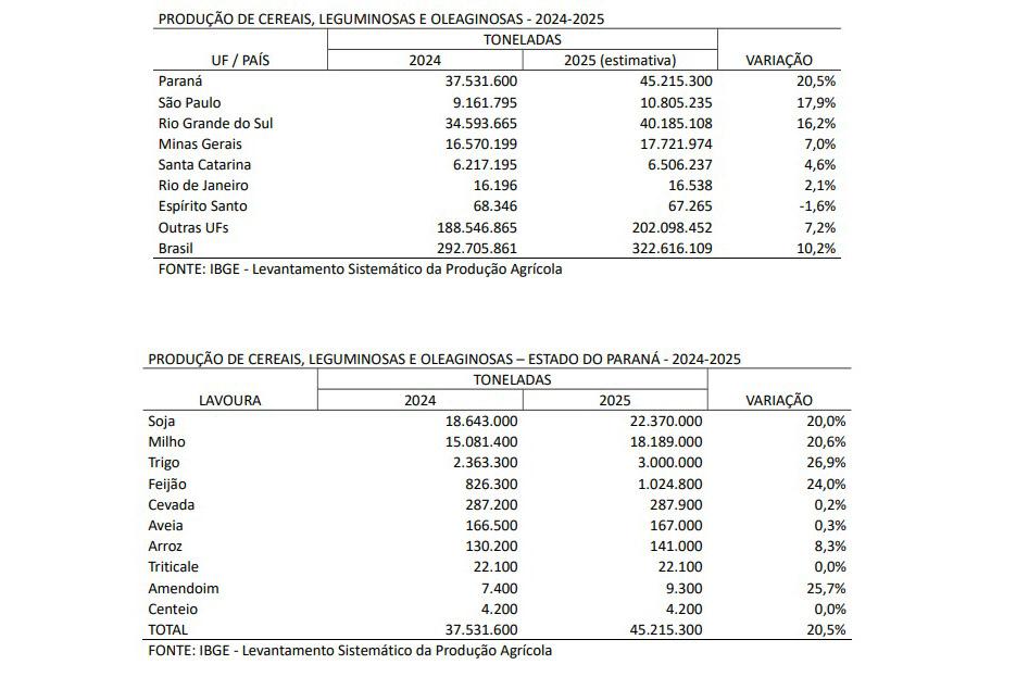 A estimativa mais recente do Instituto Brasileiro de Geografia e Estatística (IBGE) sobre a produção de cereais, leguminosas e oleaginosas, divulgada na semana passada, aponta para uma colheita de 45,2 milhões de toneladas no Paraná em 2025. Esse volume poderá representar acréscimo de 20,5% em relação às 37,5 milhões de toneladas produzidas em 2024, sendo o maior aumento relativo entre os estados das regiões Sul e Sudeste. O Paraná também deve chegar a 14% da fatia nacional de produção.